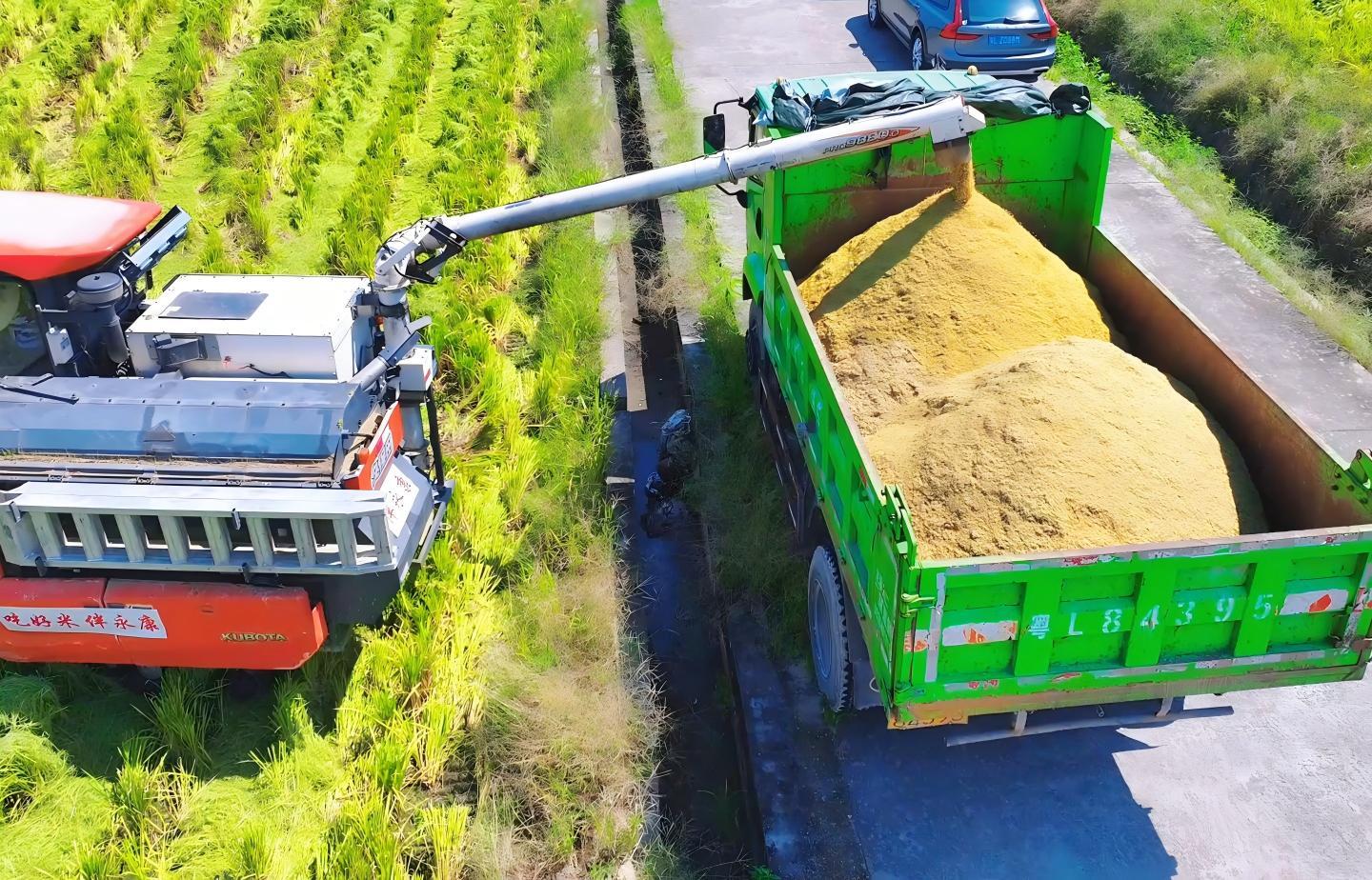 连片的稻田一片金黄,沉甸甸的稻穗压弯了腰,收割机开足马力作业,割稻、脱粒、碎秆、装粮一气呵成,金黄的稻谷通过输送管直接装入运粮车。